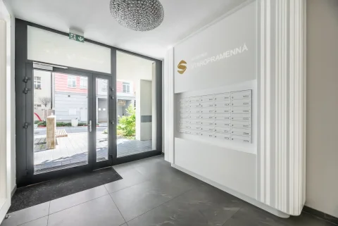 Základem stavby jsou vápenopískové bloky, které zajišťují nadstandardní protihlukovou izolaci a vynikající tepelně akumulační vlastnosti – budete tak bydlet v tichém a příjemně temperovaném prostředí po celý rok s nízkými provozními náklady. Reprezentativní společné prostory s koberci, lustry a výtahy podtrhují kvalitu celé rezidence už při vstupu do domu.